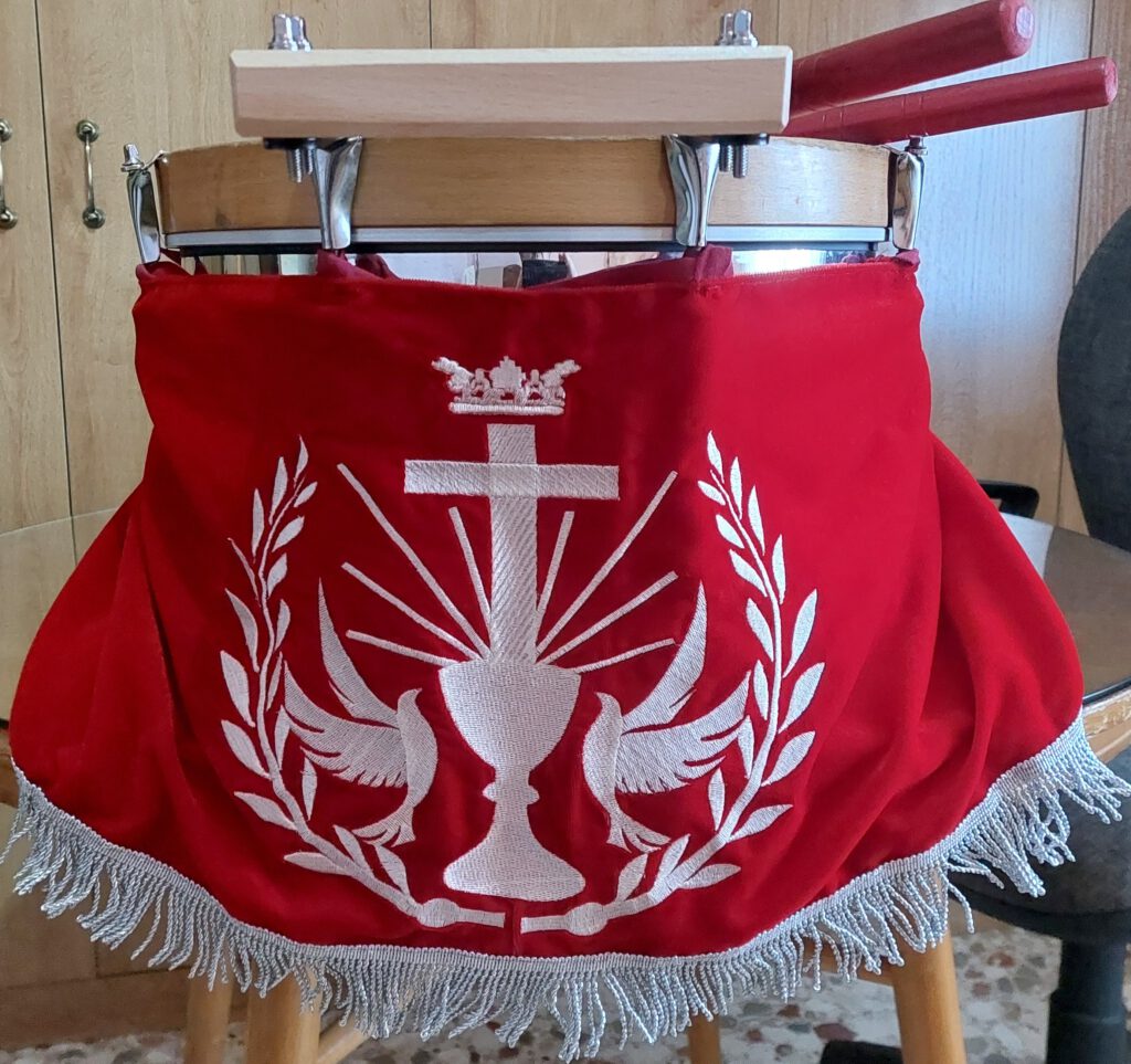 - NUEVO ESTANDARTE DE LA COFRADÍA: Estandarte bordado realce enriquecido y aplicación dorada con sedas de colores sobre terciopelo de algodón de color burdeos y rematado en su parte inferior por una franja de malla dorada rematada con un fleco de bellota. La imagen de Jesús en la Oración en el Huerto, estampada con el sistema de sublimación. Se personaliza el Estandarte con el emblema de la Cofradía en la parte inferior e irá salpicado con ramilletes de olivo. Se completa el Estandarte con un cordón dorado terminado con dos borlas rematadas con