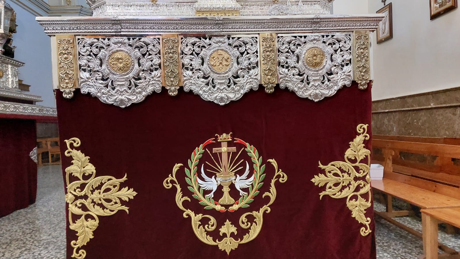 - PEANA PARA JESÚS DEL CALVARIO: La peana está realizada en aluminio y revestida de metal plateado y repujado, cada lateral lleva grabado el emblema de la Cofradía en metal repujado en oro.